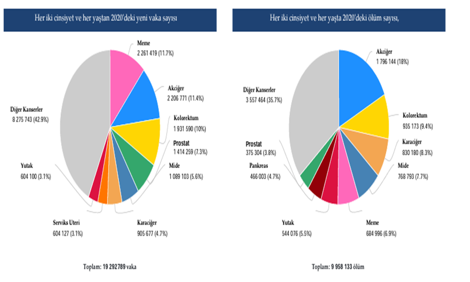Dünya Sağlık Örgütü - Uluslararası Kanser Araştırma Ajansı (IARC) dünya kanser istatistiklerine göre 2020 yılına ait kanser yeni vaka ve ölüm oranları şöyledir: